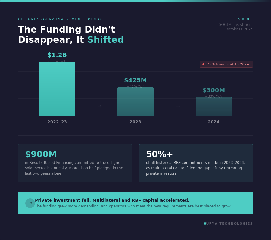 Private investment fell. Multilateral capital rose. The funding didn’t disappear, it grew more demanding. And that changes everything about how PAYGO operators need to prepare
